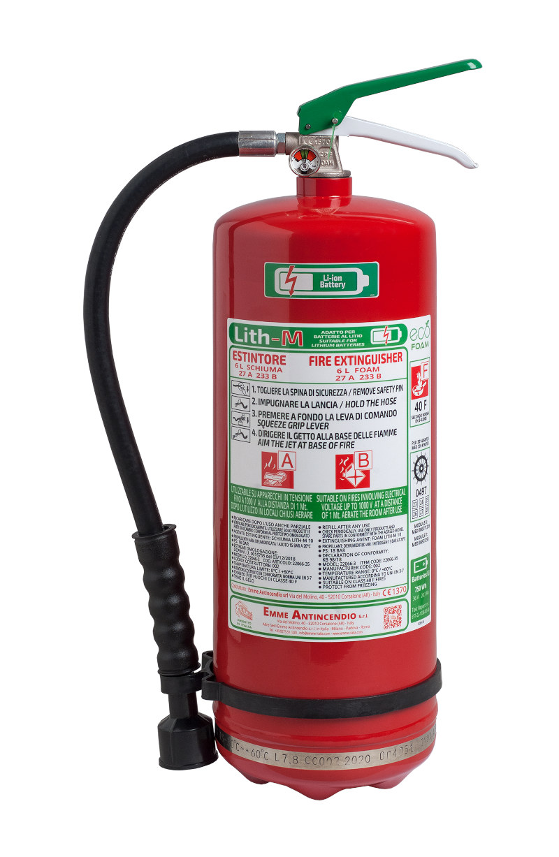 Die wirksame Bekämpfung von Bränden, die durch Lithiumbatterien üblicher Größe (klassifiziert bis zu mittlerer Leistung, Computer, tragbare Geräte, E-Bikes, schnurlose Geräte) mit einem Gesamtgewicht der Batterie bis zu 12 kg brutto, kann von geschultem Personal mit einem Feuerlöscher durchgeführt werden, der über eine ausreichende Kühlkapazität verfügt und an diesen Bränden getestet wurde. Das Emme-Sortiment an Lithiumbatterie-Löschern verfügt über eine ausgezeichnete Kühlkapazität und wurde direkt an Lithiumbatterien unter realen Betriebsbedin-