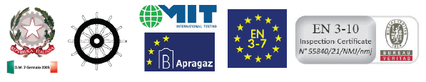 - 5 Kg Carbon Dioxide Fire Extinguisher, operating temperature from -30° C to + 60° C, built in accordance with the standard UNI EN 3-7 (D.M. 7.1.2005), approved by Marine Equipment Directive MED 2014/90/UE, certified according to Pressure Equipment Directive PED 2014/68/EU. Manufactured according at productions checks as agreed with EN 3-10.