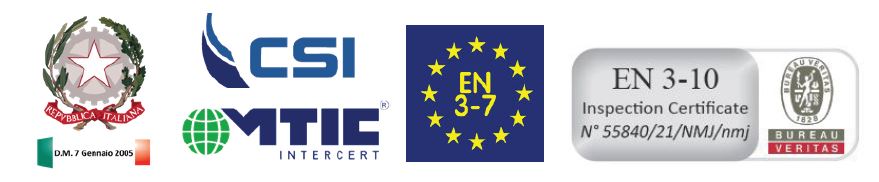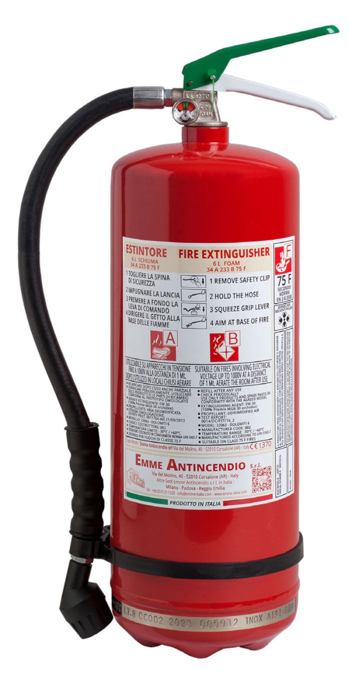 - 6 L foam fire extinguisher, temperature range from -30°C to +60°C, manufactured in accordance to UNI EN 3-7 (D.M. 7.1.2005), certified according to the directive for pressure equipment PED 2014/68/EU.