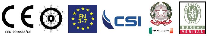 6 L foam fire extinguisher, temperature range from -30°C to +60°C, manufactured in accordance to UNI EN 3-7 (D.M. 7.1.2005), approved Marine Equipment Directive MED 2014/90/EU, certified according to the directive for pressure equipment PED 2014/68/EU. Manufactured according at productions checks as agreed with EN 3-10.