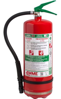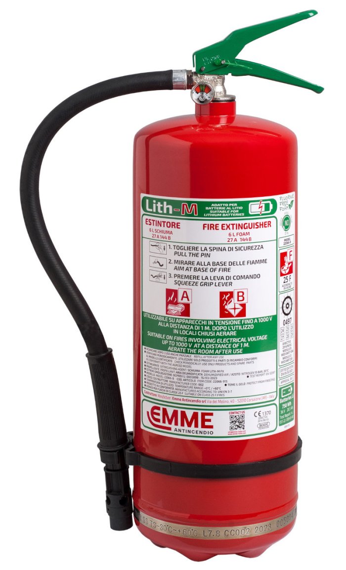 A new model of portable Fluorine Free 6 L foam ABF tested on lithium battery; manufactured in accordance to UNI EN 3-7, approved by Marine Equipment Directive MED 2014/90/UE, certified according to the directive for pressure equipment PED 2014/68/UE.  Manufactured according at productions checks as agreed with EN 3-10. Certified by Benor.