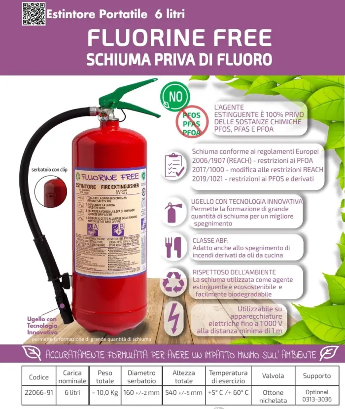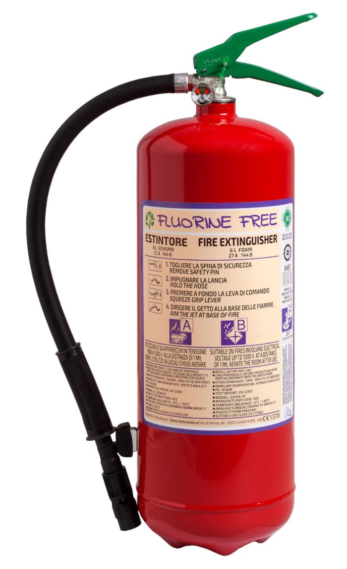 - 6 L foam fire extinguisher, temperature range from +5°C to +60°C, manufactured in accordance to UNI EN 3-7, approved Marine Equipment Directive MED 2014/90/EU, certified according to the directive for pressure equipment PED 2014/68/EU. Manufactured according at productions checks as agreed with EN 3-10.