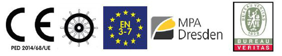 EN 3-7:2008, approved to European Marine Directive MED 2014/90/EU, S.O.L.A.S. (Safety of life at sea) ‘74 (2000), certified according to the directive for pressure equipment PED 2014/68/EU.