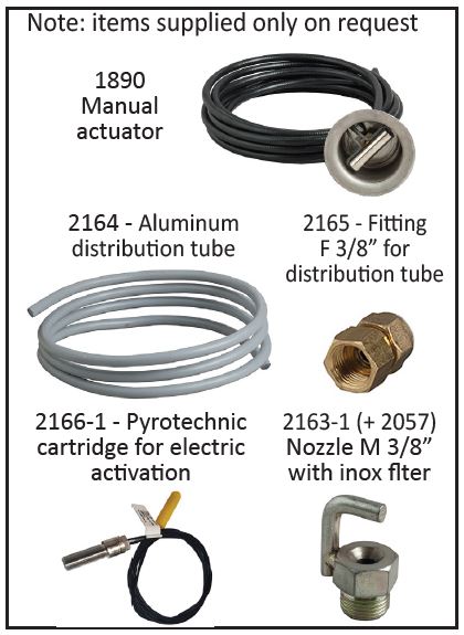 They are systems created and designed to be installed to protect unattended premises on a constant basis. The installation can take place internally and externally to the room to be protected, the extinguishant is supplied via special nozzles, connected to the aluminum pipe, for discharge at a pre-established point. The valve equipped with a thermo-expanding bulb allows the application of the activation cable (optional) and/ or the pyrotechnic cartridge (optional) for activation from remote control or detector for installation of the device outside the engine compartment. The valve is also equipped with a pressure switch for constant signalling of the pressure inside the device.