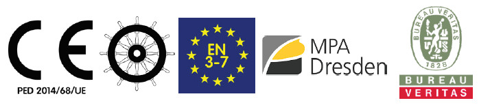 - 6 Kg powder fire extinguisher, temperature range from -30°C to +60°C, manufactured in accordance to UNI EN 3-7, approved Marine Equipment Directive MED 2014/90/EU, certified according to the directive for pressure equipment PED 2014/68/EU. Manufactured according at productions checks as agreed with EN 3-10.