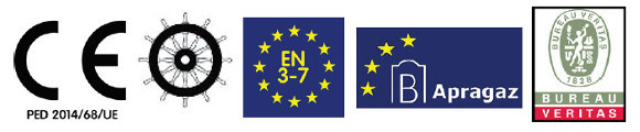 - 2 kg Co2 fire extinguisher, temperature range from -30°C to +60°C, manufactured in accordance to EN 3-7, approved to European Marine Directive MED 2014/90/EU, certified according to the directive for pressure equipment PED 2014/68/EU. Manufactured according at productions checks as agreed with EN 3-10.