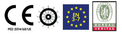 EN 3-7, approved to European Marine Directive MED 2014/90/EU, S.O.L.A.S. (Safety of life at sea) ‘74 (2000), certified according to the directive for pressure equipment PED 2014/68/EU.