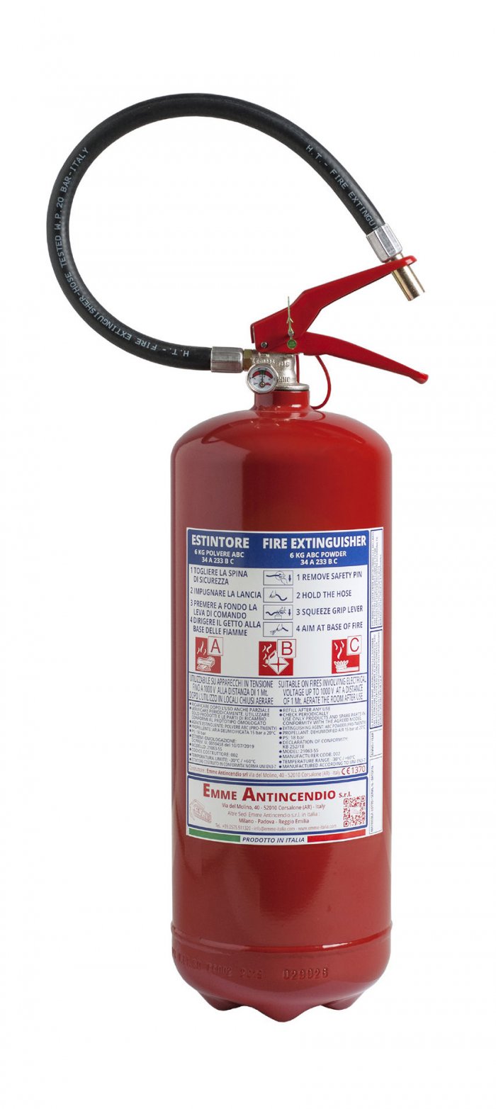 - 6 Kg powder fire extinguisher, temperature range from -30°C to +60°C, manufactured in accordance to UNI EN 3-7 (D.M. 7.1.2005), approved Marine Equipment Directive MED 2014/90/EU, certified according to the directive for pressure equipment PED 2014/68/EU. Manufactured according at productions checks as agreed with EN 3-10.
