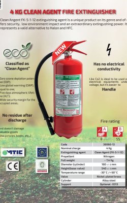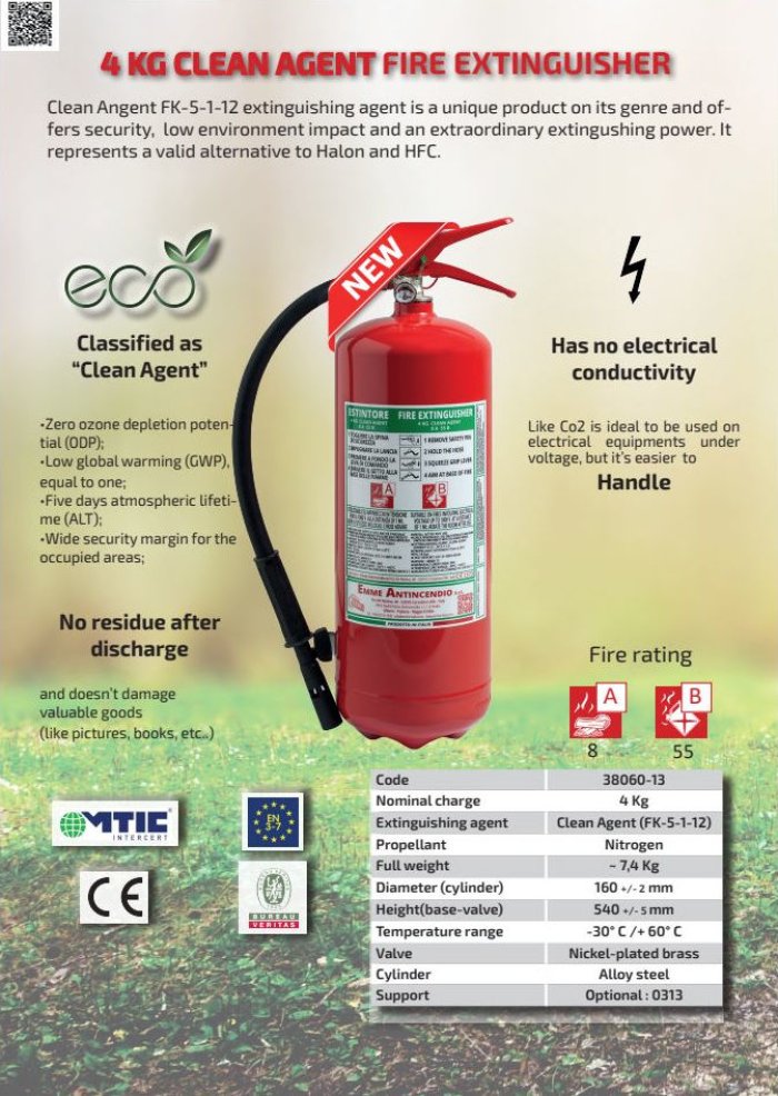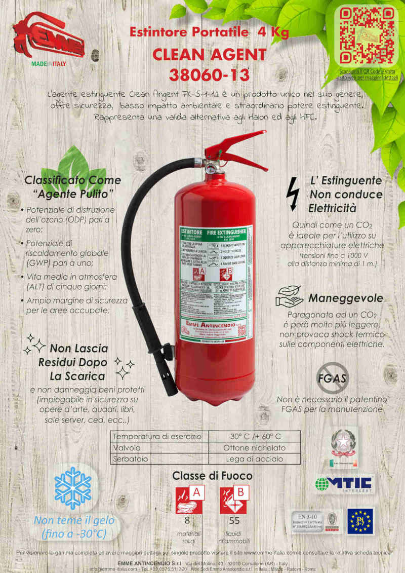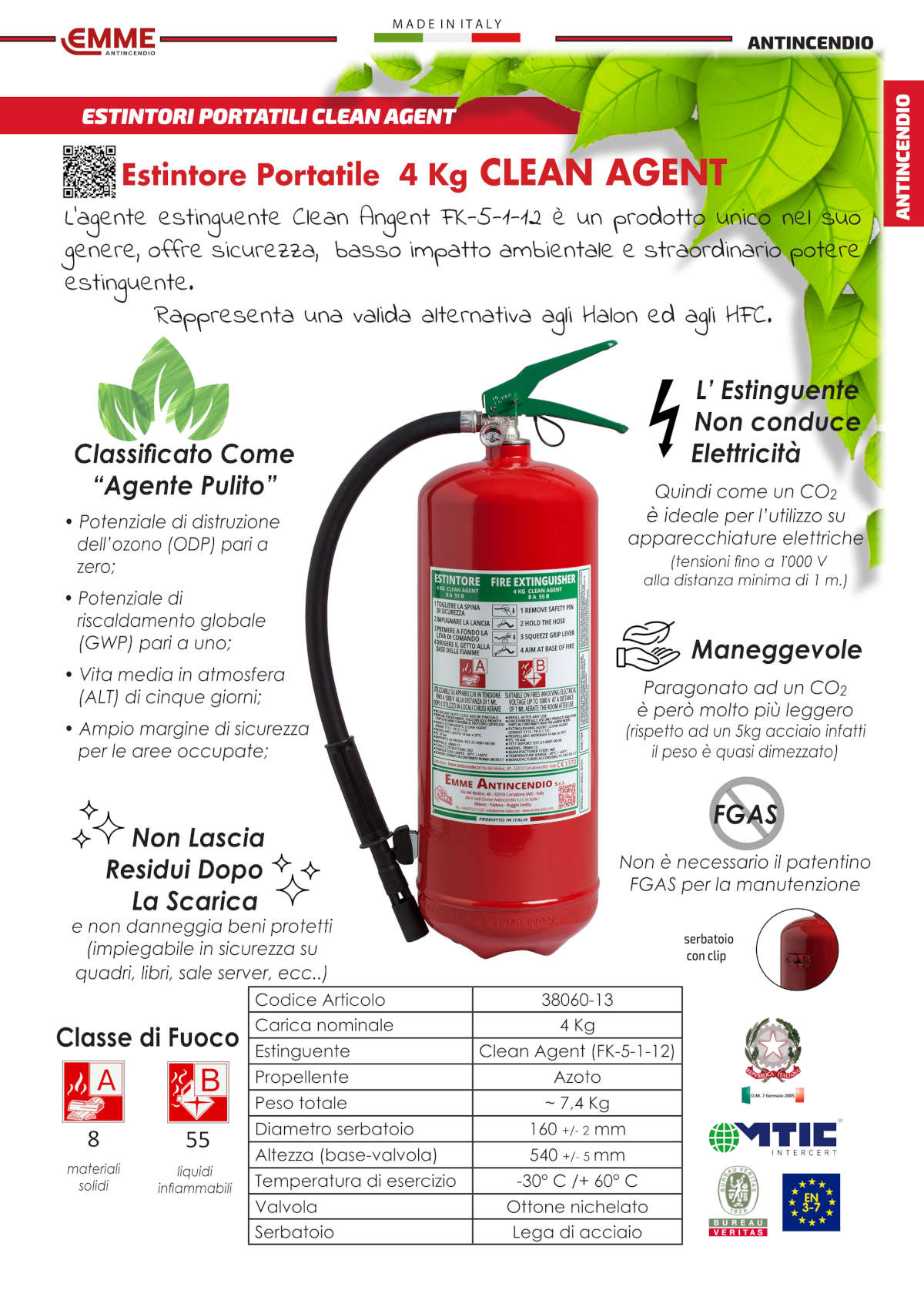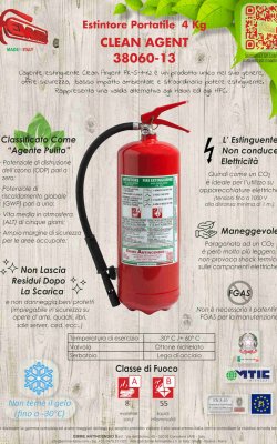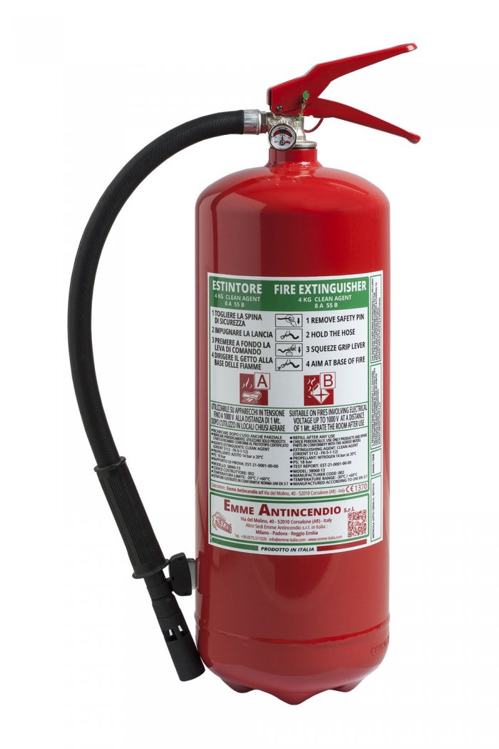- Estintore a Clean Agent da 4 Kg , temperatura di utilizzo da -30°C a +60°C, costruito in accordo alla norma UNI EN 3-7, certificato secondo la direttiva per attrezzature a pressione PED 2014/68/UE, realizzato in conformità ai controlli di produzione secondo norma EN 3-10.