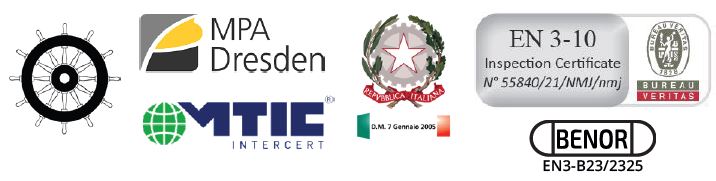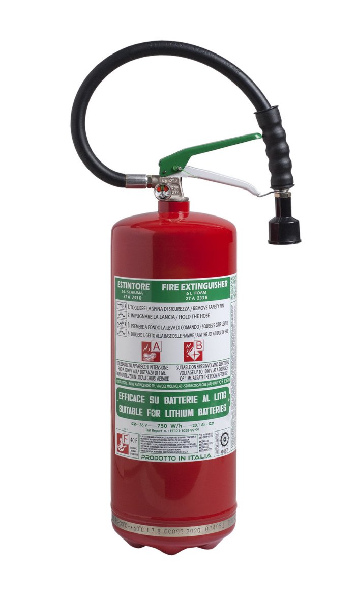 - Estintore a Schiuma da 6 Litri, temperatura di utilizzo da 0°C a +60°C, costruito in accordo alla norma UNI EN 3-7 (D.M. 7.1.2005), approvato Marine Equipment Directive MED 2014/90/UE, certificato secondo la direttiva per attrezzature a pressione PED 2014/68/UE. Estintore realizzato in conformità ai controlli di produzione secondo norma EN 3-10. Certificato Benor.