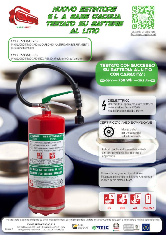 Sulla base delle prove eseguite con l'estintore in oggetto si può affermare che è possibile fermare la combustione di una batteria agli ioni di litio con un estintore a base d'acqua con additivi schiumogeni. Si è verificato che l'utilizzo dell'estintore permette di abbassare la temperatura e poter controllare le eventuali riaccensioni delle celle presenti all'interno della batteria (generate dalla reazione a catena delle stesse e dovute alla loro conformazione all'interno del pacco batteria). La batteria testata ha una tensione di 36 V con capacità di 20,1 Ah e valore energetico pari a 750 W/h. L'estintore testato risulta quindi efficace nel contenimento delle fiamme che si sprigionano da una batteria con caratteristiche uguali o inferiori rispetto a quella testata.