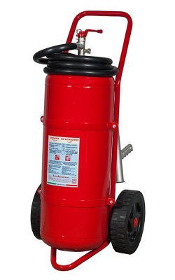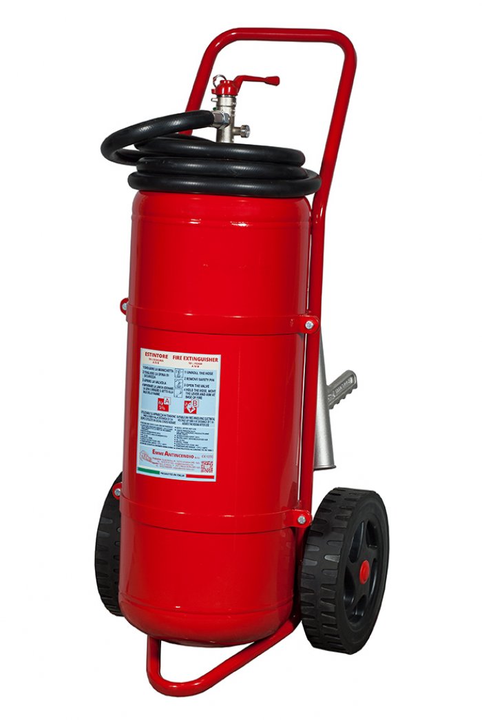 - Estintore carrellato a schiuma da 50 L., temperatura di utilizzo da +5°C a +60°C, costruito in accordo alla norma UNI 9492 (D.M. 6.3.92), certificato secondo la direttiva per attrezzature a pressione PED 2014/68/UE.
