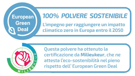 - Agente Estinguente: Polvere ABC Rigenerata, MAP 30% . 100% SOSTENIBILE che ha ottenuto la certificazione da Milieukeur, che ne attesta l’eco-sostenibilità nel pieno rispetto dell’ European Green Deal