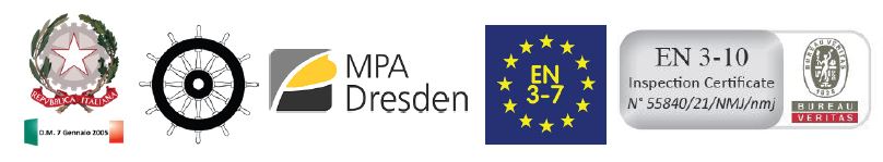 Estintore a polvere da 9 Kg, pressurizzato al momento dell'uso, temperatura di utilizzo da -30°C a +60°C, costruito in accordo alla norma UNI EN 3-7 (D.M. 7.1.2005), approvato Marine Equipment Directive MED 2014/90/UE, certificato secondo la direttiva per attrezzature a pressione PED 2014/68/UE. Estintore realizzato in conformità ai controlli di produzione secondo norma EN 3-10.
