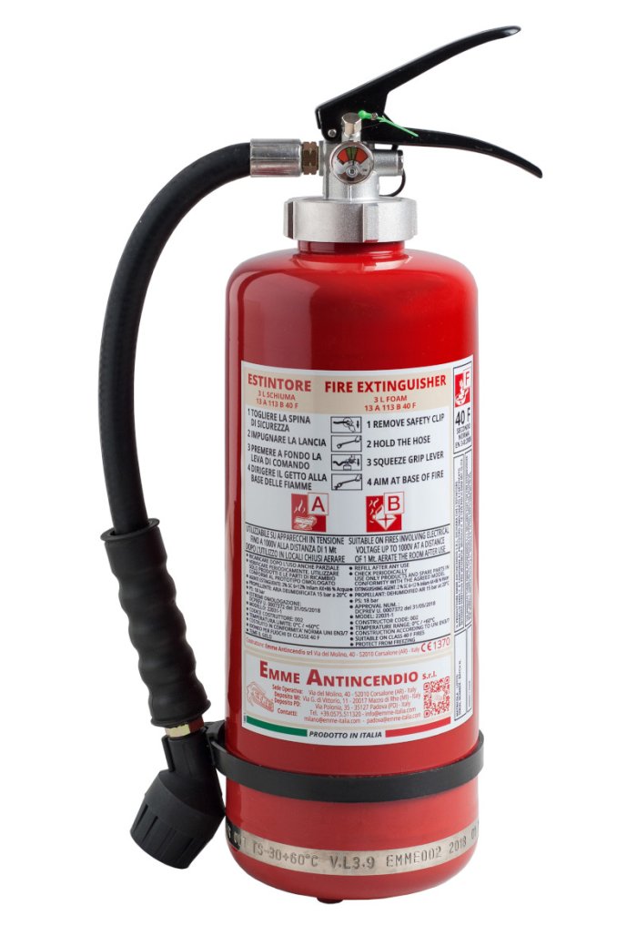- Estintore a Schiuma da 3 Litri , temperatura di utilizzo da 0°C a +60°C, costruito in accordo alla norma UNI EN 3-7 (D.M. 7.1.2005), approvato Marine Equipment Directive MED 2014/90/UE, certificato secondo la direttiva per attrezzature a pressione PED 2014/68/UE. Estintore realizzato in conformità ai controlli di produzione secondo norma EN 3-10.