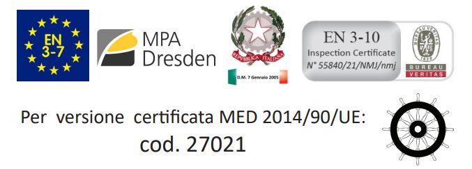 - Estintore a schiuma da 2 Litri , temperatura di utilizzo da 0°C a +60°C, costruito in accordo alla norma UNI EN 3-7:2008, approvato da European Marine Directive MED 2014/90/UE, certificato secondo la direttiva per attrezzature a pressione PED 2014/68/UE, realizzato in conformità ai controlli di produzione secondo norma EN 3-10.