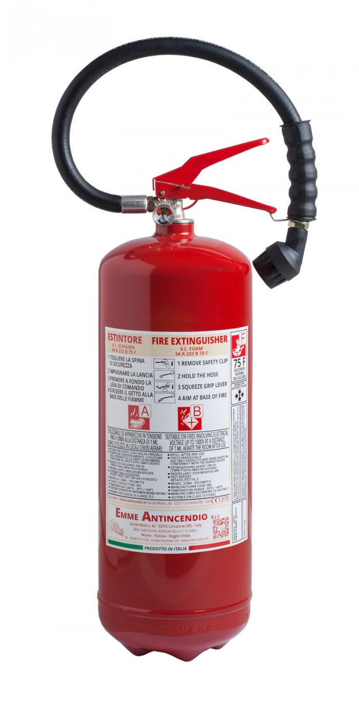 - Estintore schiuma da 6 Litri, temperatura di utilizzo da -30°C a +60°C, costruito in accordo alla norma UNI EN 3-7:2008 (D.M. 7.1.2005), approvato da European Marine Directive MED 2014/90/UE, certificato secondo la direttiva per attrezzature a pressione PED 2014/68/UE.