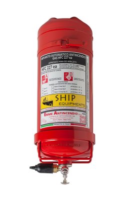 Impianto antincendio automatico Serie Mare Easy a gas HFC, disponibile in cariche da 3, 6, 12Kg , temperatura di utilizzo da -30°C a +60°C, certificato secondo la direttiva per attrezzature a pressione PED 2014/68/UE. Certificato RINA secondo ISO 9094:2015.