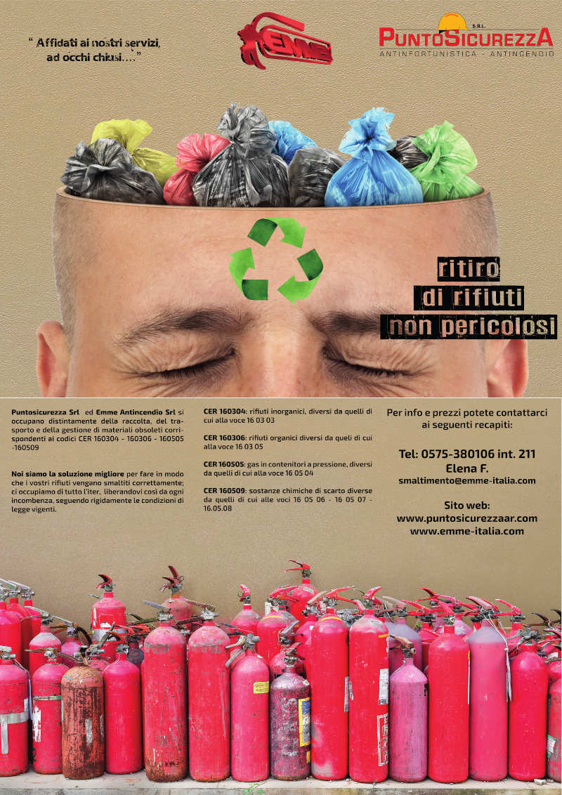 L'azienda, leader nella produzione di estintori, offre quindi il servizio di raccolta, trasporto, gestione e smaltimento di estintori presso aziende, con regolare formulario, dei rifiuti specificati nei codici relativi CER.