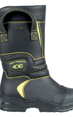 Rigger in pelle fiore ignifuga, idrorepellente, colore nero, con fodera in membrana COFRA-TEX WATERPROOF UNIVERSAL con sistema di costruzione WATERPRO-TECH, antistatica, antishock, antiscivolo, dotata di lamina antiforo APT Plate non metallica Perforazione Zero Plus Tomaia in pelle fiore ignifuga (spessore mm 2,0/2,2) rifinita con miscele minerali che conferiscono particolari caratteristiche di idrorepellenza e resistenza alle aggressioni termiche. La pelle, dopo il contatto con la fiamma viva, non presenta segni di post-combustione e post-incandescenza, non subendo quindi alcun segno di danneggiamento. Soletta estraibile HEAT BARRIER, anatomica, antistatica, forata, profumata, isolante dalle alte temperature, rivestita in tessuto. Il comfort termico all’interno della calzatura è assicurato grazie alla speciale mescola di poliuretano messa a punto per garantire isolamento dal caldo.