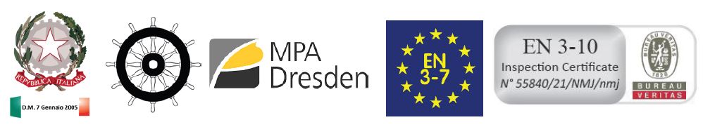 - 2 kg pulverbrannslukker ,temperaturområde fra-30°C til +60°C, produsert i henhold til UNI EN 3-7 (D.M. 7.1.2005), godkjent Marine Equipment Directive MED 2014/90/UE, sertifisert i henhold til direktivet for trykkpåkjent utstyr PED 2014/68/EU. Produsert i henhold til produksjonskontroller i henhold til EN 3-10.