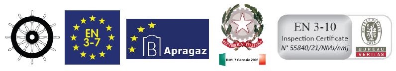 - 5 kg brannslukningsapparat med karbondioksid, temperaturområde fra-30°C til +60°C, produsert i henhold til UNI EN 3-7 (D.M. 7.1.2005), godkjent Marine Equipment Directive MED 2014/90/UE, sertifisert i henhold til direktivet for trykkpåkjent utstyr PED 2014/68/EU. Produsert i henhold til produksjonskontroller i henhold til EN 3-10.